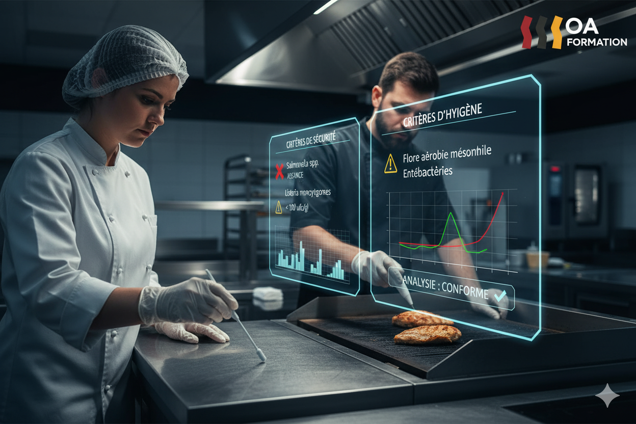 Chez OA Formation, nous démystifions ces analyses. Un critère microbiologique, c’est la norme chiffrée (limites maximales) de micro-organismes (bactéries, levures, moisissures) autorisés dans un produit alimentaire ou sur une surface donnée. Ces critères sont définis par la réglementation européenne (Règlement CE 2073/2005) et sont la référence utilisée par les laboratoires et la DDPP (Direction Départementale de la Protection des Populations) lors des contrôles.