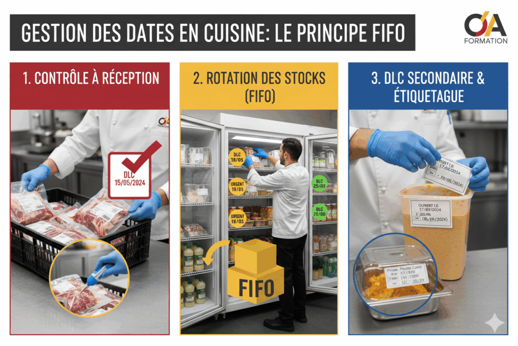 - Rotation des stocks : C’est la règle de base. Le produit le plus ancien (celui dont la DLC est la plus proche) doit être utilisé en premier.