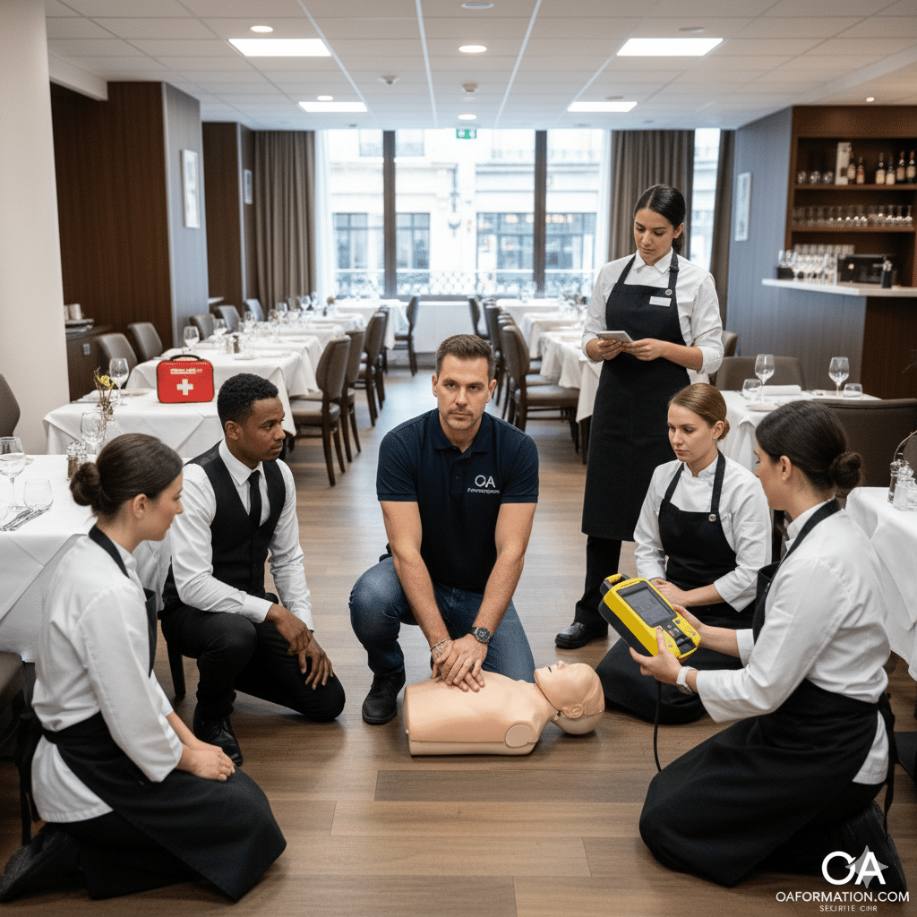 Chez oaformation.com, nos formateurs sont des professionnels du CHR qui connaissent les problématiques de l’hôtellerie et de la restauration sur le bout des doigts. Nous nous assurons que les scénarios de simulation (comme l’utilisation d’un défibrillateur ou la gestion d’une hémorragie) correspondent aux risques réels de votre activité.