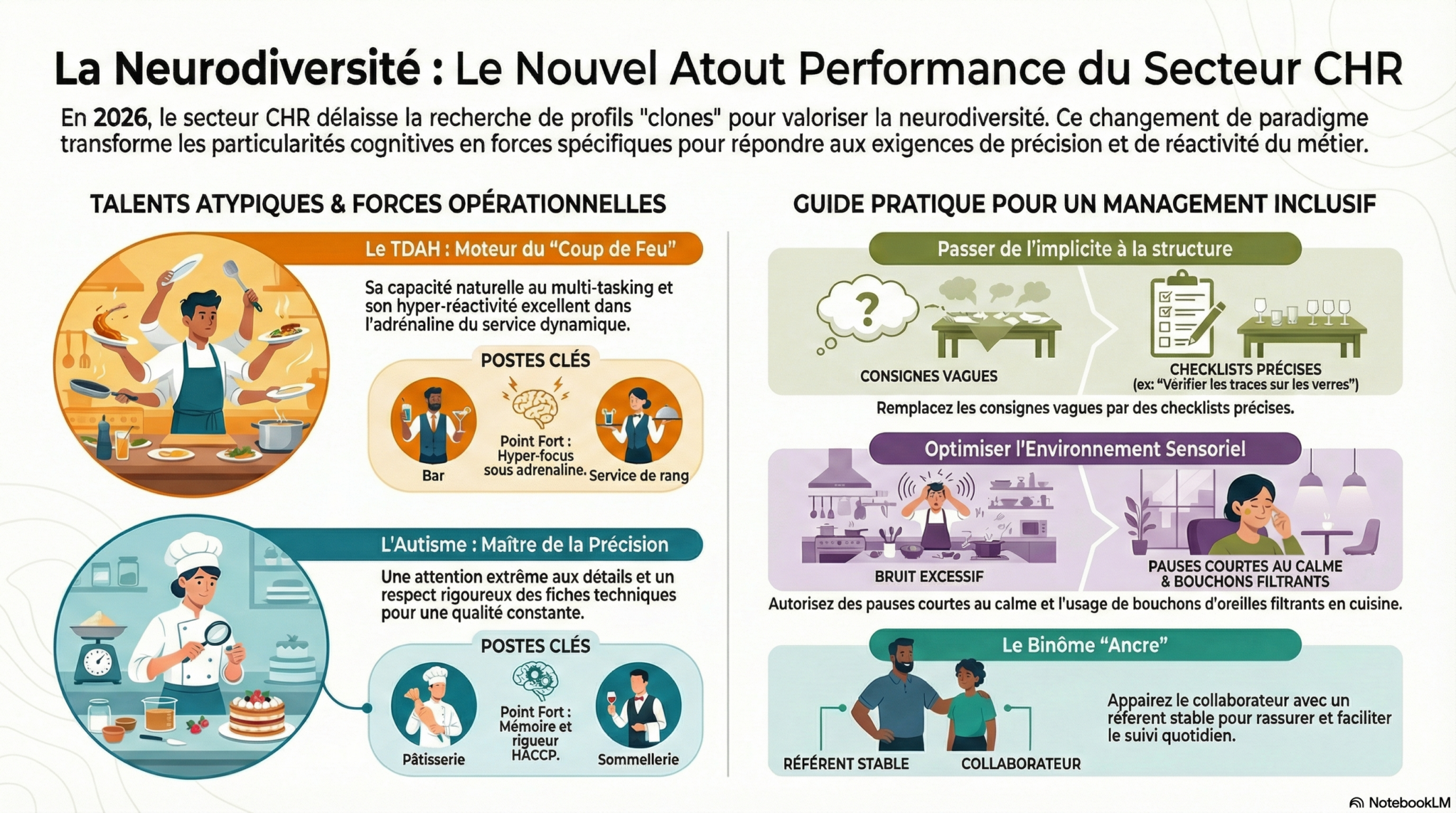 Pendant longtemps, le secteur des Cafés, Hôtels et Restaurants (CHR) a cherché des « clones » : des profils polyvalents, capables de résister au stress de la même manière. En 2026, la donne a changé. Face à la quête de sens et à l’exigence de précision, la neurodiversité (TDAH, autisme, dyslexie, etc.) n’est plus vue comme un défi RH, mais comme un levier d’excellence.