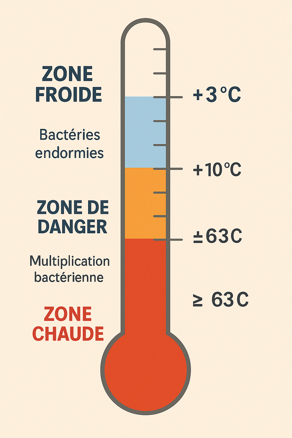 • Le Chaud (Maintien) : Doit être maintenu à +63∘C minimum jusqu’au service. Au-dessus de +63∘C, les bactéries sont neutralisées ou ne se développent plus.